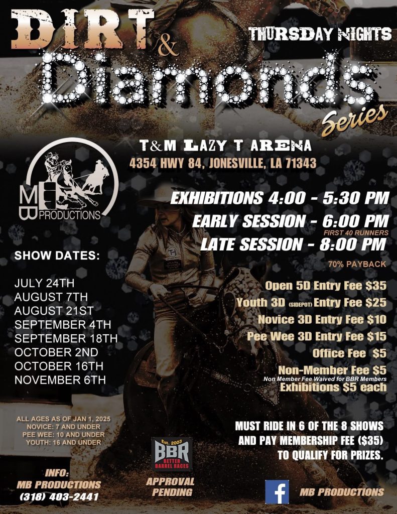 - Upcoming Barrel Racing Series- Friday Night LightsComing to the T&M Lazy T Arena, Jonesville, LA for 2025! We will have Open 5D events, on Friday nights. There will be a buckle to the fastest time of the series (must be a member for …