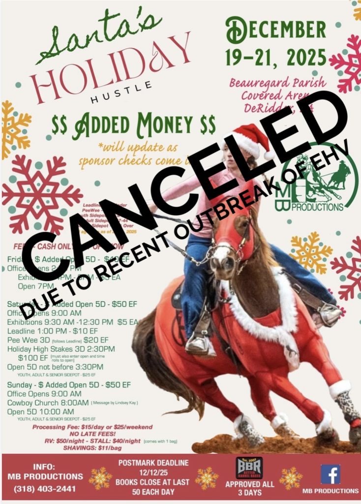 - Santa’s Holiday HustleDetails: December 19-21, 2025 Added Money Weekend At Beauregard Parish Covered Arena BBR Approved Arkansas Elite Approved Family Oriented Atmosphere! Come join us, we’d love to have you. Please see flyer for more details!